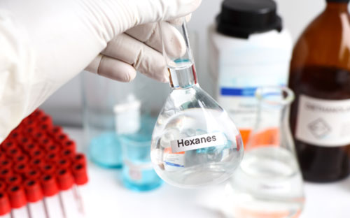 - Hexane can be toxic if inhaled or ingested and can cause skin and eye irritation. Proper personal protective equipment (PPE) should be worn when handling hexane, including gloves, safety glasses, and protective clothing.